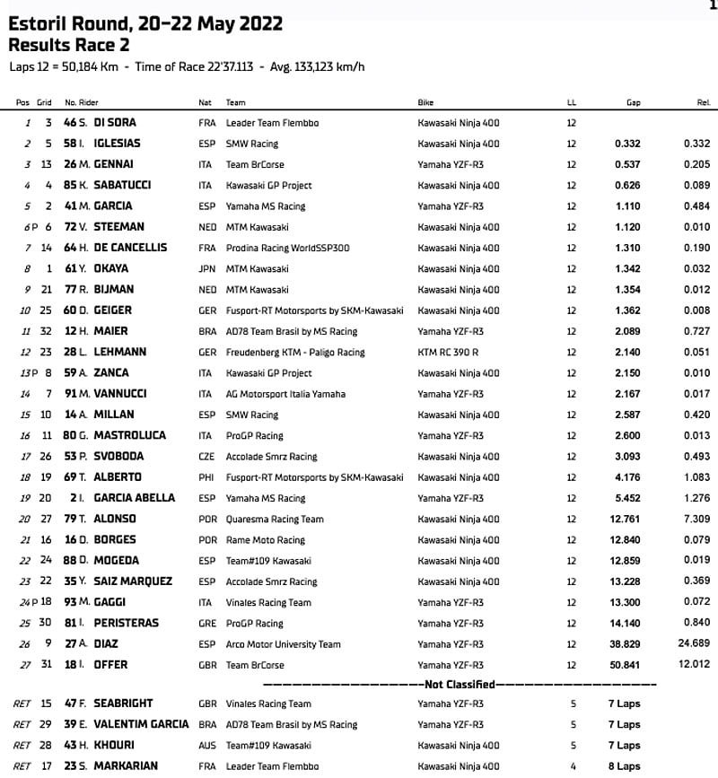 Deux tours plus tard, le Français apparaissait au commandement, et malgré une opposition vigoureuse, parvenait à franchir la ligne d’arrivée en tête, inscrivant ainsi sa deuxième victoire dans la catégorie (après Portimão 2021) et gravant les tablettes avec la plus grande remontée victorieuse de l’histoire du Championnat FIM World Supersport 300 !