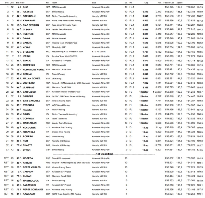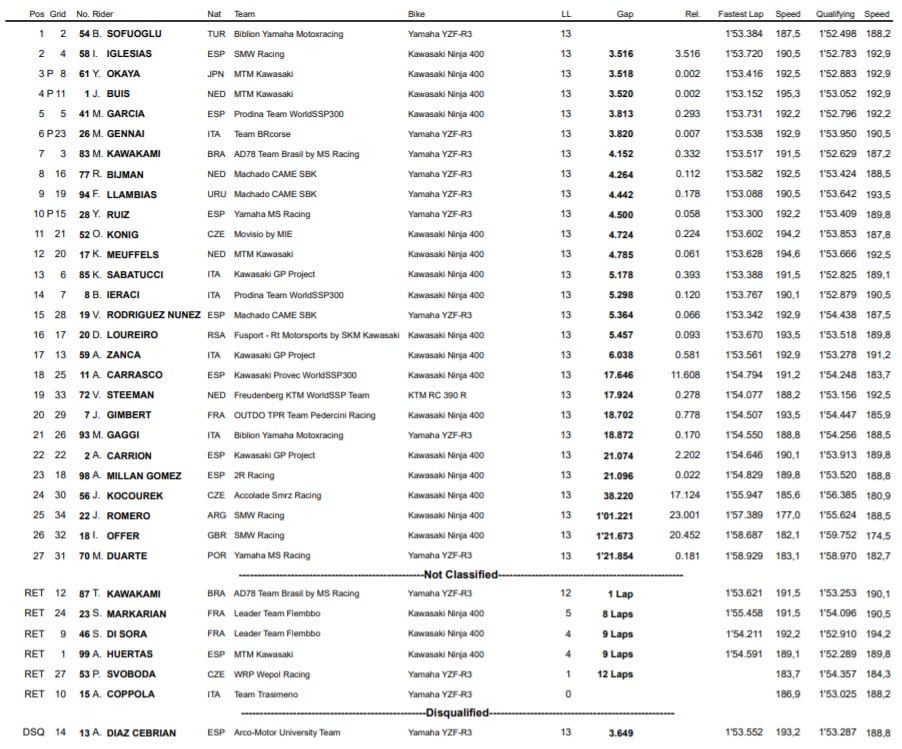 Passée l’annonce du décès de Dean Berta Viñales, le paddock et le plateau Supersport 300 en particulier a réussi à se remobiliser pour affronter la journée du dimanche. Comme on l’a dit, Huertas n’a pas brillé par ses performances au cours de celle-ci, partant deux fois à la faute dans le virage 6, avant de devoir définitivement abandonner. La victoire est finalement revenue à Sofuoğlu, pour qui il s’agit du deuxième succès cette saison.