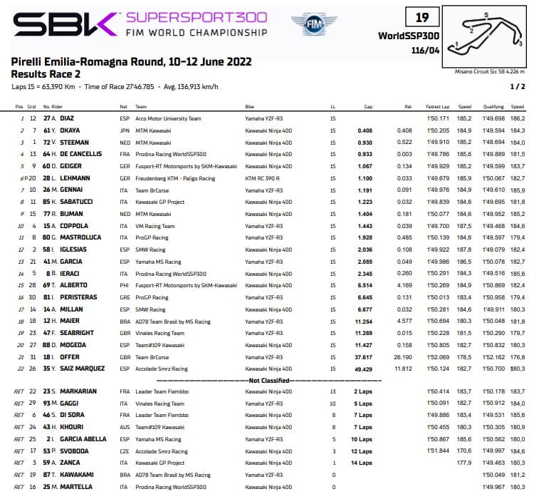 World Supersport 300 Course 2 : Résultats