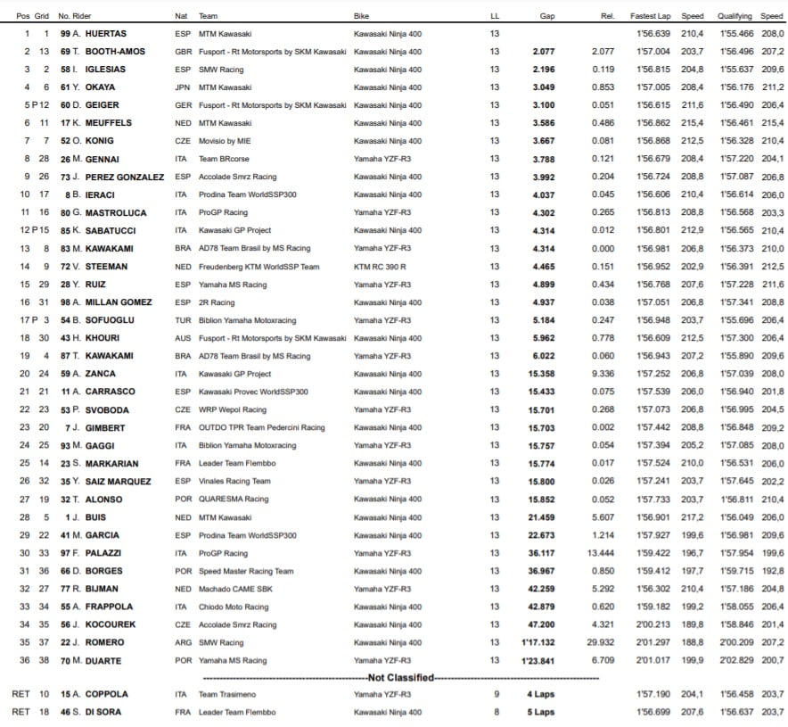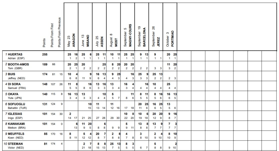 Au championnat du monde, Huertas remporte ainsi le titre avec 255 points, soit une large avance face à Booth-Amos (189 points). Buis, qui avait décroché le titre en 2020, achève quant à lui cette saison à la troisième place avec 174 points, alors que le Français Di Sora, qui a décroché sa première victoire dans la catégorie dans le weekend (ainsi que le premier succès de l’hexagone en Supersport 300), boucle l’année en quatrième position, avec 148 unités.