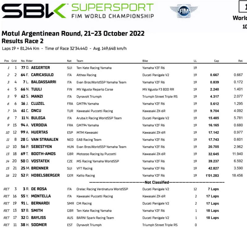 Lorenzo Baldassarri a pris la tête dans le dernier tour, mais la patte du lion Dominique Aegerter est arrivée dans le dernier tour et l’a dépassé, tandis que Lorenzo Baldassarri s’est un peu énervé et a perdu la deuxième place au profit de Federico Caricasulo sur Ducati. Le coureur d’Althea quitte l’Argentine avec un double podium très positif. Stefano Manzi, cinquième sur la Triumph, est également confirmé parmi les protagonistes, tandis que Nicolò Bulega termine la course en huitième position, loin des leaders.