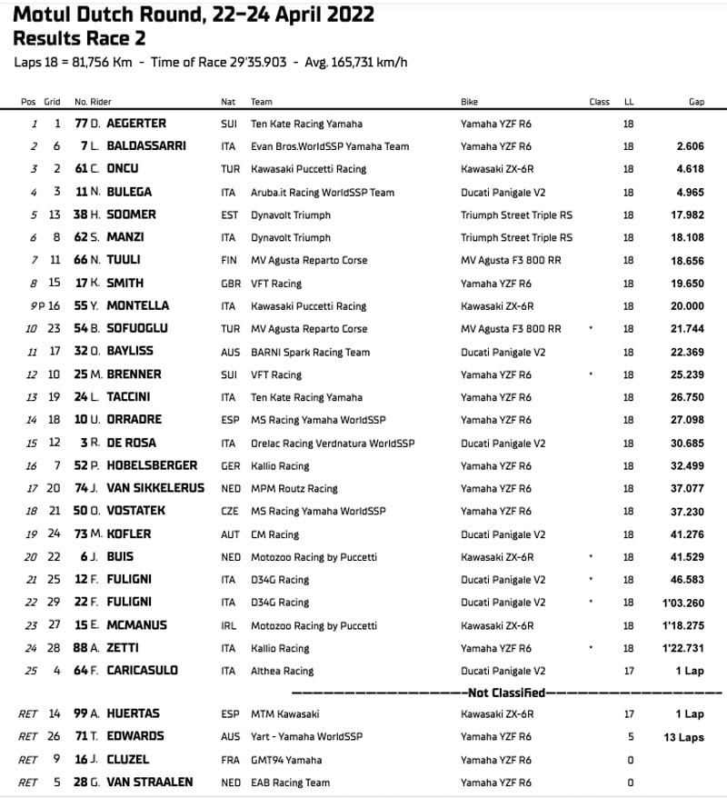 Pour le pilote suisse, il s’agit de sa troisième victoire consécutive, une série qui a commencé à Aragón, lorsque Aegerter et Baldassarri avaient terminé à égalité. L’Italien est maintenant à -30 points de la tête, tandis que Bulega est en troisième position, à 39 points. Dans la course 2 aux Pays-Bas, certains protagonistes attendus ont disparu de la scène, comme le Français Jules Cluzel, qui a chuté à nouveau : le pilote Yamaha n’est pas en mesure de retrouver sa brillance d’antan.