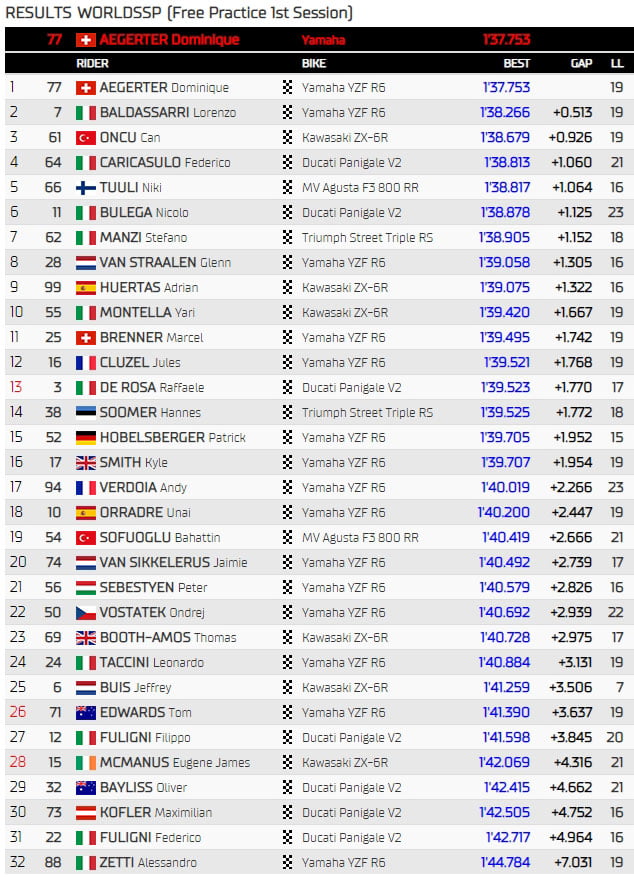 A Assen ce matin, lors de la FP1, ce sont ainsi les deux Yamaha de Dominique Aegerter (Ten Kate Racing Yamaha) et Lorenzo Baldassarri (Evan Bros. WorldSSP Yamaha Team), ainsi que la Kawasaki de Can Öncü (Kawasaki Puccetti Racing) qui ont précédé les Ducati Panigale V2 et MV Agusta F3 800 RR de Federico Caricasulo (Althea Racing), Niki Tuuli (MV Agusta Reparto Corse) et Nicolò Bulega (Aruba.it Racing – Ducati).