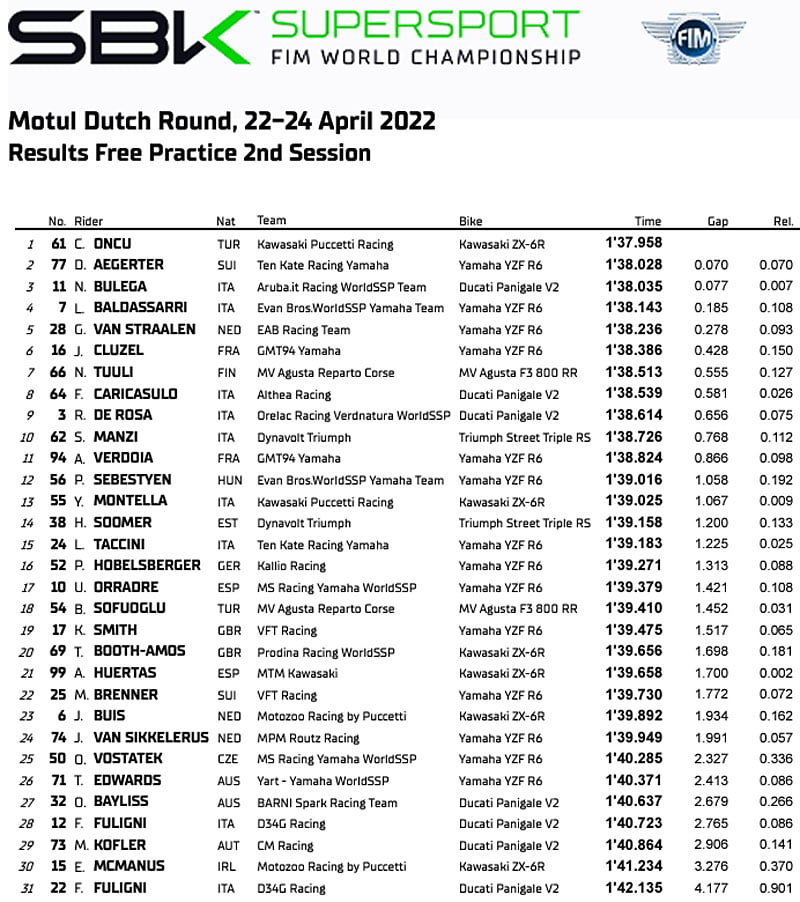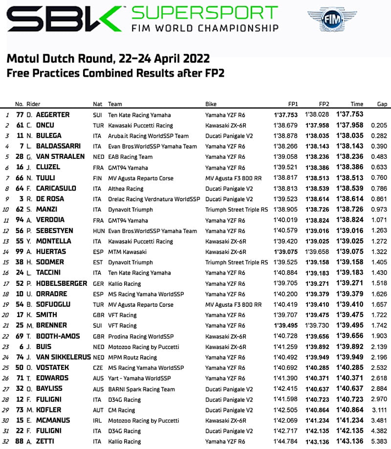Mais cela n’a pas suffi à surpasser le champion du monde en titre, Dominique Aegerter (Ten Kate Racing Yamaha), un des trois pilotes qui pourtant ne se sont pas avérés plus rapide en FP2 qu’en FP1. Au final, le Suisse conserve donc un avantage de 2 dixièmes sur le Turc et presque 3 sur l’Italien.