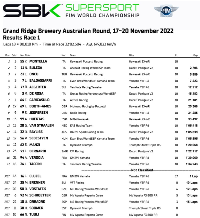 Résultats de la Course 1 des Supersport à Phillip Island :
