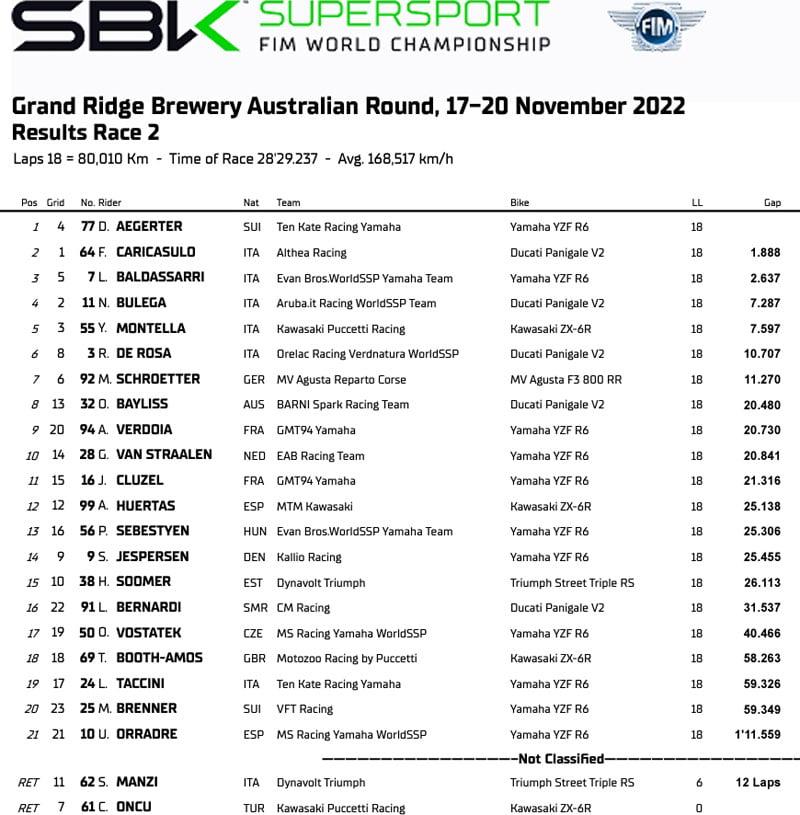 Résultats de la Course 2 des Supersport à Phillip Island :