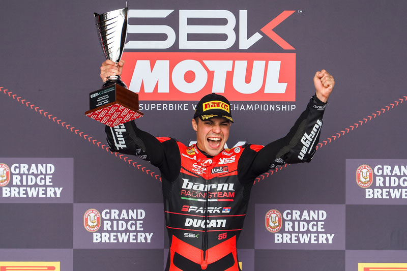 L’Italien a mis fin à une disette de plus de 460 jours sans victoire en WorldSSP, malgré un mauvais départ. Son succès fut toutefois facilité par l’arrêt aux stands obligatoire pour changer de pneus, le pilote italien étant entré au même moment que Stefano Manzi (Pata Yamaha Ten Kate racing) accroché à ses basques, avant que son équipe ne le relâche avec un avantage de 6 secondes. Stefano Manzi termine donc deuxième de cette course 1, tandis que Marcel Schroetter (MV Agusta) complète le top-3.