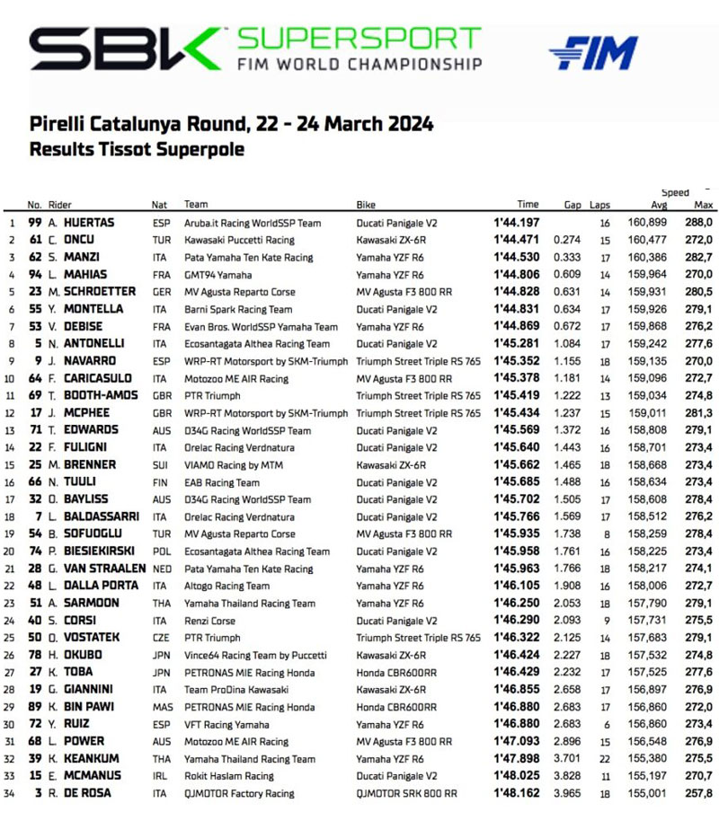 Lors d’une Superpole scindée en deux suite à une chute de Bahattin Sofuoglu, Adrian Huertas a repoussé les attaques d’un Can Oncu dans une condition physique presque optimale après la longue épreuve qui a suivi l’accident d’Assen, il y a presque un an. « Vous verrez qu’à Barcelone je serai encore meilleur » avait confié le Turc à son équipe avant de partir. Il a tenu parole. Côté Italien, Stefano Manzi a amené la Yamaha à la troisième place, qui vaut quand même la première ligne. Tandis que Yari Montella, double vainqueur en Australie et leader du Championnat du Monde, a dû se contenter de la sixième place. Il sprintera depuis le bord de la deuxième ligne.