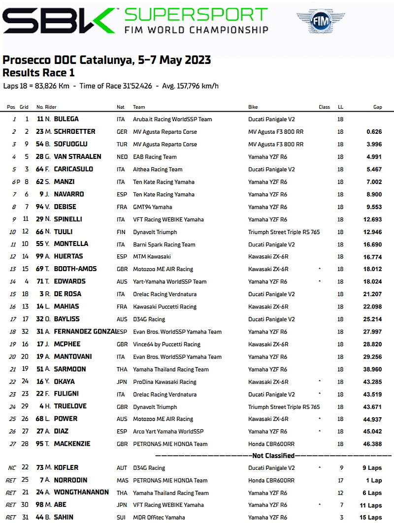 Schrötter, Sofuoğlu et Manzi se battent ensuite pour le podium derrière le pilote Ducati Aruba. Dans la finale, Schrötter en fait un peu plus en essayant de rattraper Bulega. Merveilleuse bataille pour la troisième place entre Manzi et Sofuoğlu avec des coups de carénages à n’en plus finir. Le pilote Ten Kate franchit la ligne d’arrivée en tête avec 6 millièmes d’avance sur le Turc, mais il est relégué à la sixième place derrière Glenn Van Straalen et Federico Caricasulo en raison d’une coupure de piste survenue plus tôt.