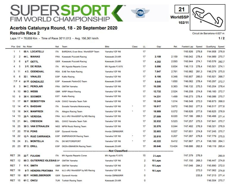 Andrea Locatelli était l’homme à battre cette année : A Montmeló, il a célébré d’un seul coup son dixième succès en onze courses et le titre mondial Supersport. Il est le premier Italien de l’histoire à être sacré champion de la catégorie Supersport, qui est un Championnat du Monde depuis 1999. Avant lui, Paolo Casoli et Fabrizio Pirovano avaient remporté le championnat, mais à leur époque, ce n’était que la Coupe du Monde.