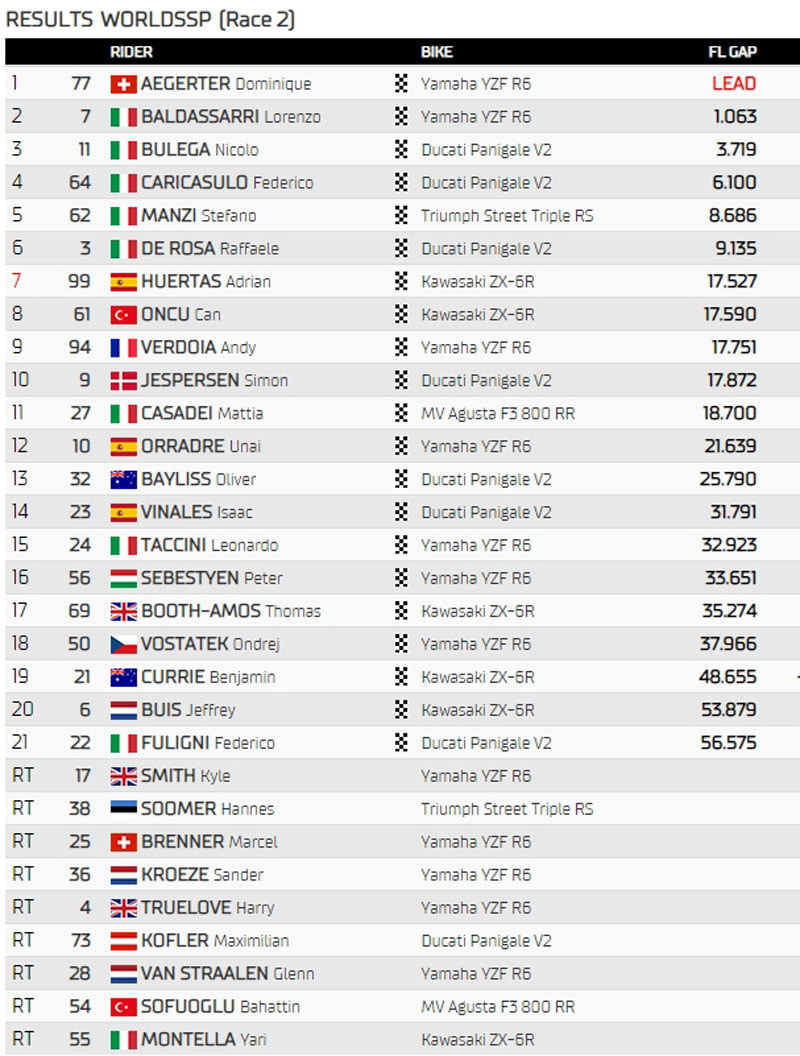 Pour cette course de 19 tours qui va se dérouler avec des températures de 28° dans l’air et 38° au sol sous un ciel couvert, la première ligne est constituée de Dominique Aegerter, Nicolò Bulega (Aruba.it Racing WorldSSP Team) sur sa Ducati Panigale V2 et du Néerlandais Glenn Van Straalen (EAB Racing Team) qui a chuté sans se blesser lors de la première course sur sa Yamaha blanche et rouge. Suivent Can Öncü (Kawasaki Puccetti Racing) sur sa ZX-6R, Federico Caricasulo (Althea Racing) sa Ducati, et donc Lorenzo Baldassarri qui gagne une place en l’absence de Jules Cluzel tandis que Andy Verdoïa (GMT94 Yamaha) s’élancera 11e après avoir obtenu son meilleur résultat de la saison hier (8e).