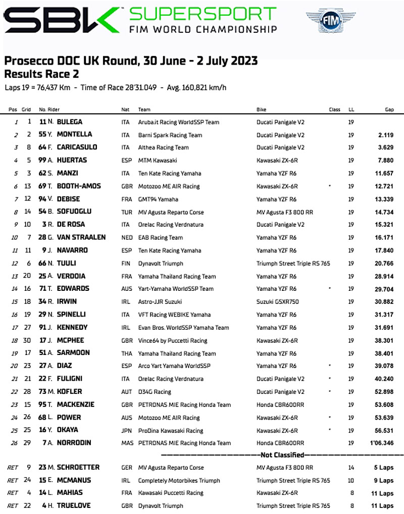 Résultats de la Course-2 des Supersport à Donington Park :