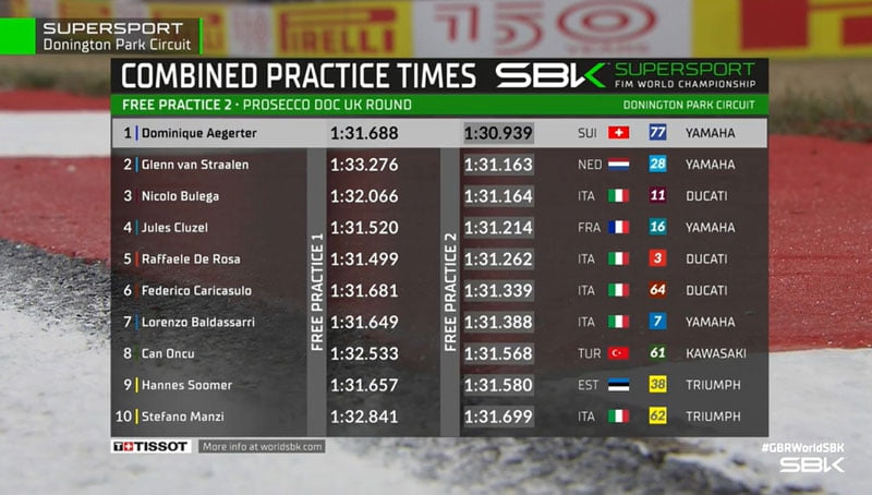 Au terme de la première journée, l’actuel leader du championnat précédait de 2/10 la Yamaha de Glenn van Straalen (EAB Racing Team) et la Ducati d’un Nicolo Bulega (Aruba.it Racing WorldSSP Team) qui découvrait lui aussi le tracé britannique.