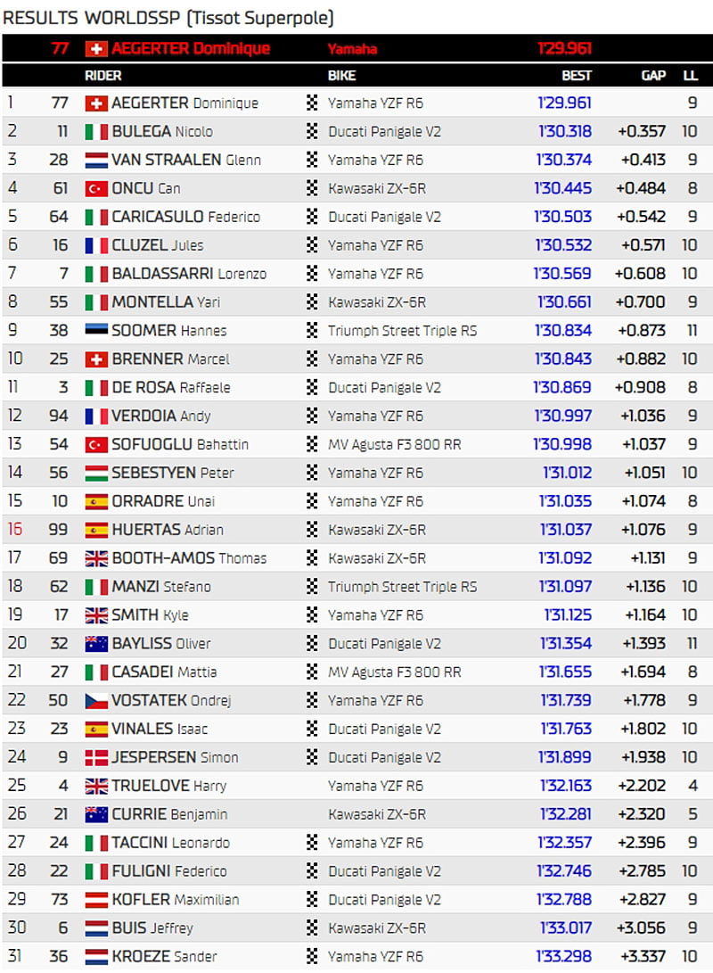 En effet, après avoir signé le 6e temps le matin, derrière Raffaele De Rosa (Orelac Racing VerdNatura WorldSSP), Jules Cluzel (GMT94 Yamaha), Lorenzo Baldassarri (Evan Bros. WorldSSP Yamaha Team), Hannes Soomer (Dynavolt Triumph) et Federico Caricasulo (Althea Racing), le pilote suisse inscrivait en FP2 un 1’30.939 inégalé jusqu’à présent ce week-end.