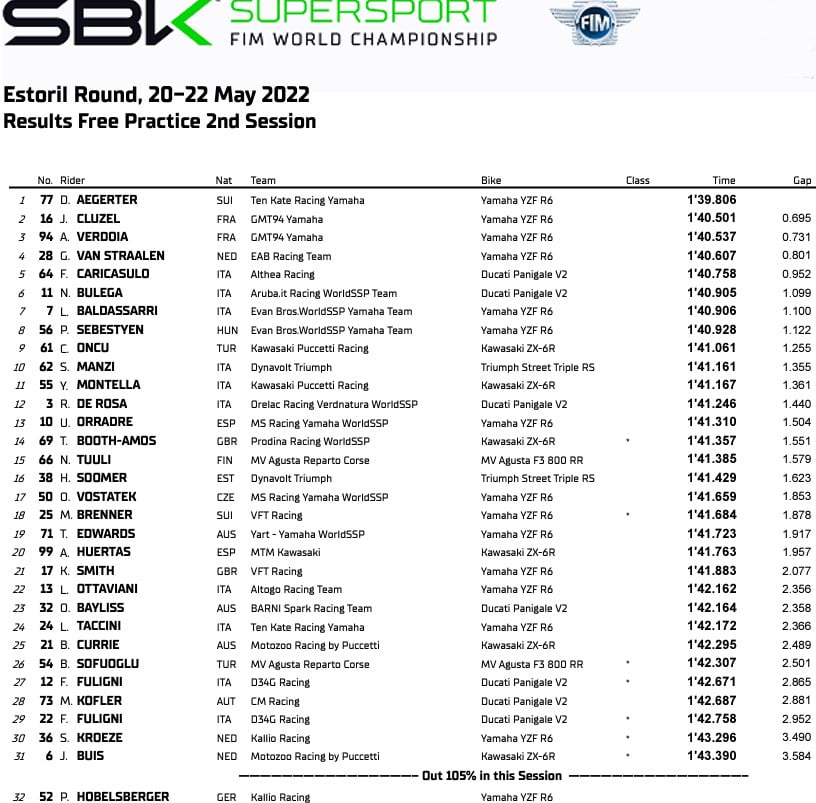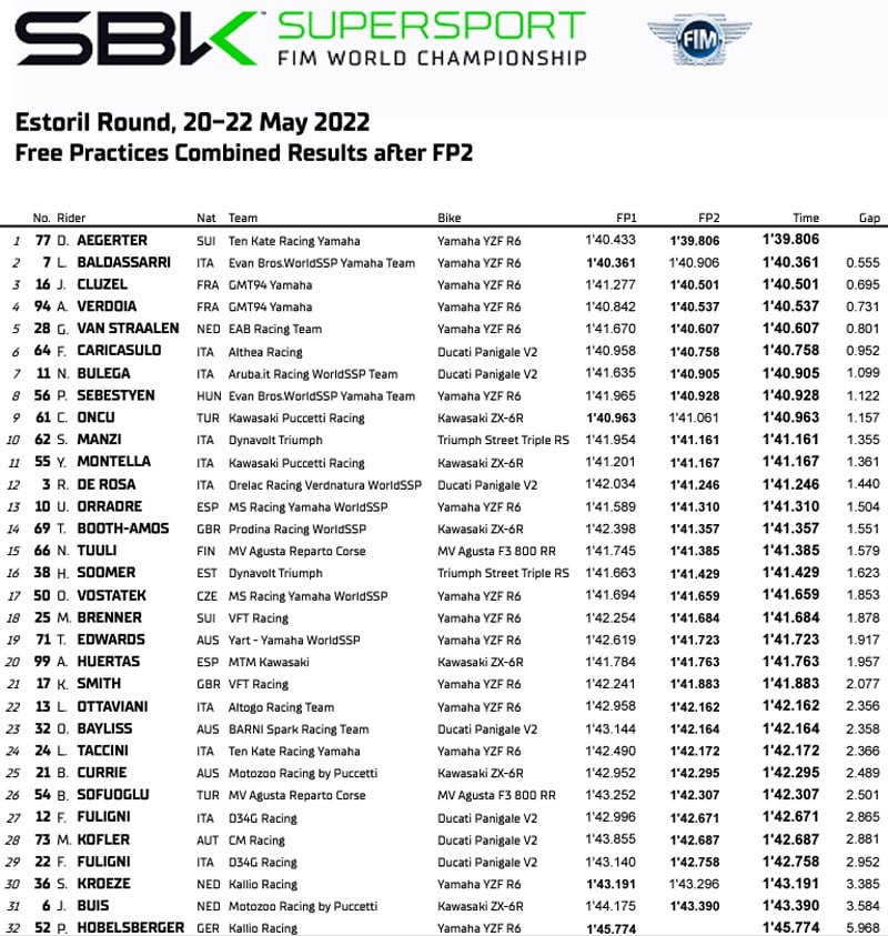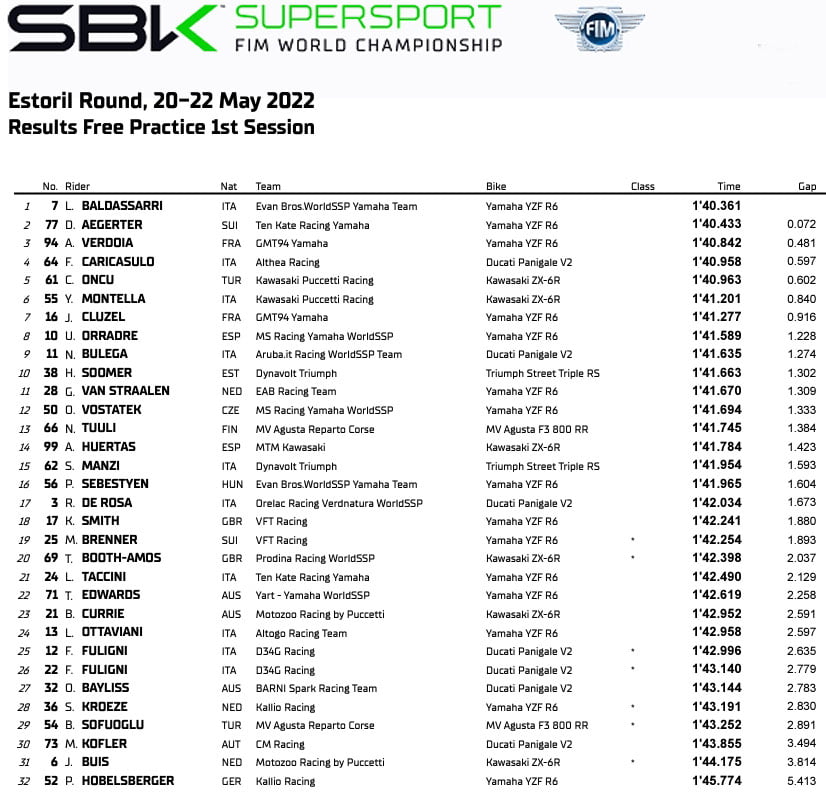 Ce matin, c’est pourtant Lorenzo Baldassarri (Evan Bros. WorldSSP Yamaha Team) qui signait le meilleur temps de la première séance d’essais libre, devant le leader du Championnat, le pilote suisse Dominique Aegerter. On notait toutefois la bonne mise en action de Andy Verdoïa, troisième temps à moins d’une demi-seconde.