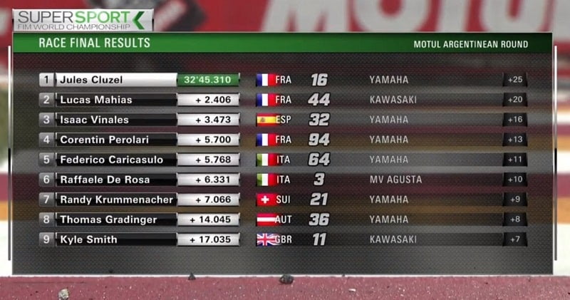En course, Caricasulo passait de la cinquième à la deuxième place au douzième tour (sur 19), tandis que Krummenacher évoluait dans le même temps de la sixième à la quatrième. Mahias deuxième à 3.0 de Cluzel avait alors 1.6 d’avance sur le groupe Krummenacher, Perolari, Caricasulo, Viñales et de Rosa.