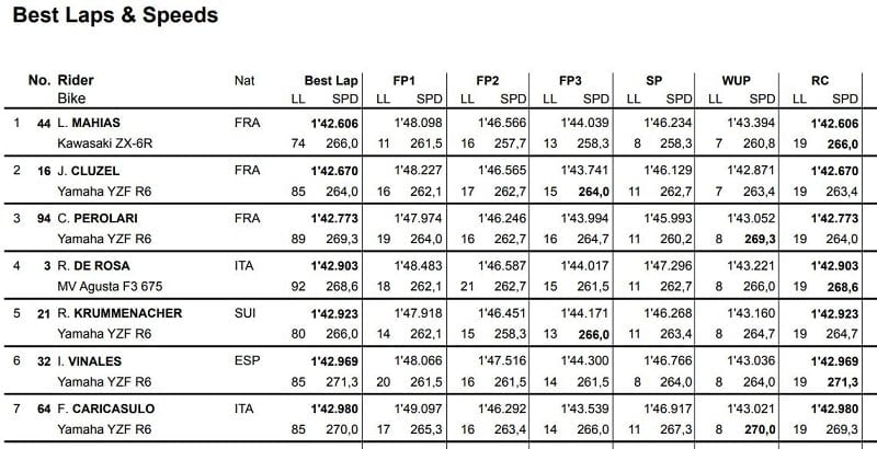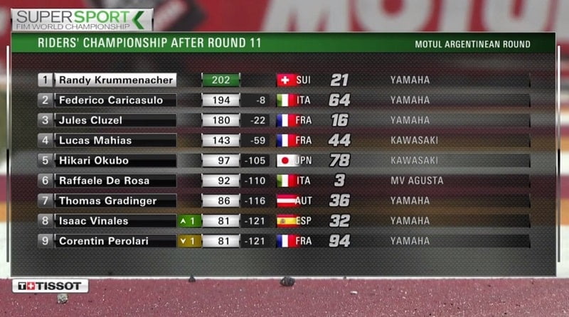 Krummenacher a remporté jusqu’ici les courses de Phillip Island, Aragón, Imola et Misano, tandis que Caricasulo s’imposait à Assen, Jerez et Portimão. Après l’épreuve portugaise, juste avant Magny-Cours, les deux coéquipiers de l’équipe « Bardahl Evan Bros. WorldSSP Team » n’étaient séparés que par 10 points au Championnat, avec l’avantage au Suisse.