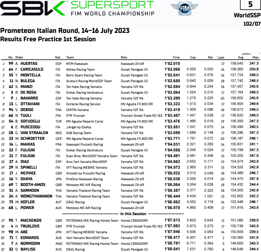 Résultats de la FP1 des Supersport à Imola :