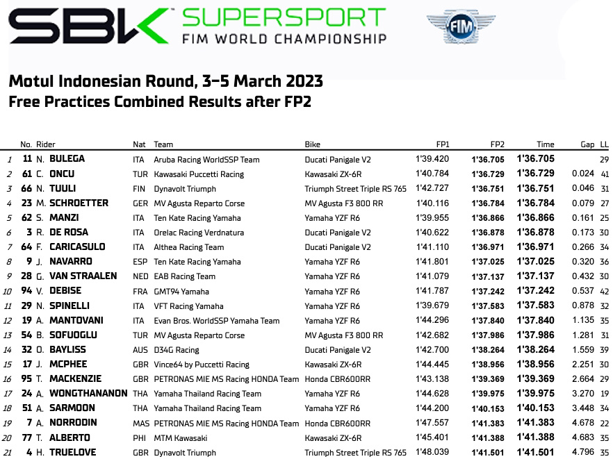 Les attentes sont cependant élevées pour Nicolò Bulega, pilote de la Ducati Panigale V2 officielle, qui arrive avec une année d’expérience de plus que lors de son premier week-end en Indonésie en 2022, où il avait terminé 6e et 7e. Il devra néanmoins aussi contenir Federico Caricasulo (Althea Racing Team), Jorge Navarro (Ten Kate Racing Yamaha), Glenn van Straalen (EAB Racing Team) et Valentin Debise (GMT94 Yamaha) qui complètent pour le moment le Top 10, alors que la révélation de l’Australie, Nicholas Spinelli (VFT Racing Yamaha) a dû se contenter de la 11e position hier.