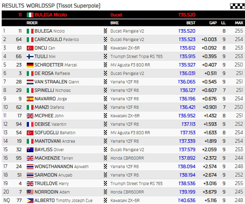 Avec 30° dans l’air, 41° au sol et un soleil qui brille, les conditions météorologique sont toujours chaudes à l’heure où les 21 pilotes se préparent pour cette qualification de 20 minutes, en l’absence de Yari Montella (Barni Spark Racing Team) et Adrian Huertas (MTM Kawasaki) blessés en Australie. On en profite pour rappeler le temps de la Superpole de l’année dernière réalisée par Niki Tuuli, en 1’35.947.