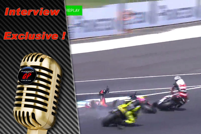“Non, non, c’est qu’en fait il y avait du vent de face et on sait que quand il y a le vent de face avec nos petites motos, ça crée vite des gros écarts entre le mec qui a une aspi et le mec qui en a quatre. Lui, je crois qu’il arrivait, et il avait quatre, donc il a dû arriver 25 km/h plus vite que d’habitude et que moi qui était premier. Donc forcément tes points de freinage sont différents. Moi je freine au point normal et lui il a freiné comme moi, sauf qu’il arrive 25 bornes plus vite. Et en plus, quand tu es devant, quand tu freines tu as du vent, alors que quand tu es derrière quelqu’un et que tu freines, tu as moins de vent sur ton corps. Donc la moto elle ralentit encore moins, et du coup quand il a pris les freins, il n’a rien compris. Et sa réaction n’a pas été bonne parce qu’il aurait pu relever la moto et rouler sur le vibreur, mais du coup il a essayé quand même de rentrer, donc c’était un peu bête. Mais voilà, bon après je veux dire, les erreurs, ça arrive. Moi, l’année dernière je percute Mahias, même si je trouve que ce n’est pas ma faute. Après, là, lui il me percute : à un moment donné c’est la course moto. Il n’y a rien à dire à personne : on roule proche, surtout cette année, donc ce sont des choses qui arrivent.”