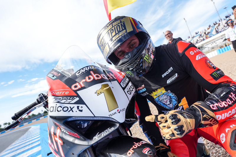 Courant sous les couleurs officielles Aruba.it Racing – Ducati, il a obtenu le titre de Champion du Monde Supersport FIM 2024, couronnant une saison exceptionnelle avec Ducati. Cela marque un accomplissement remarquable pour le pilote espagnol, qui a continué à impressionner par ses performances régulières et sa détermination, devenant ainsi au passage à 21 ans le plus jeune champion du monde Supersport de tous les temps.