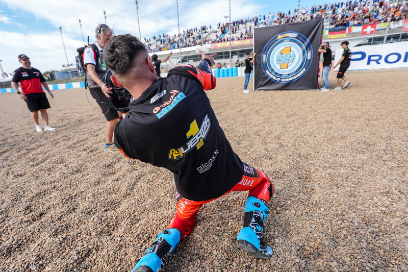 Adrian Huertas | Aruba.it Racing – Ducati : « Cela a été une saison incroyable parce que je me suis beaucoup battu. Cela n’a pas été facile lors des dernières courses car nous avons eu beaucoup de problèmes. A la fin, nous avons fait ce que nous devions faire, c’est-à-dire rester sur la moto et marquer des points. C’était vraiment important pour nous et aujourd’hui nous avons remporté le titre mondial. C’est incroyable ! C’est mon deuxième titre mondial après le championnat SSP300 de 2021 et je me sens très bien. Je tiens à remercier mon équipe car elle m’a fait confiance avant cette saison alors que je n’avais même pas terminé sur le podium dans cette catégorie. Beaucoup de gens disaient que je n’étais pas capable de le faire et que je ne répéterai pas ce que Nicolo Bulega a fait l’année dernière. Je tiens à remercier l’équipe de m’avoir fait confiance et nous sommes maintenant champions du monde ensemble. »