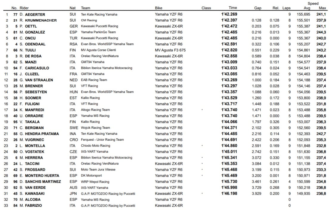 Il faudra compter sur le pilote suisse pour la victoire ce dimanche lors de la seule course disputée en catégorie Supersport. Le leader du championnat a en effet été le plus rapide de la séance, devant Randy Krummenacher et le poleman Philipp Öttl.