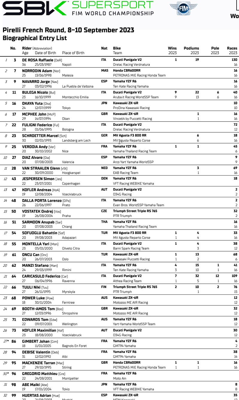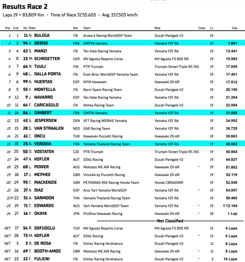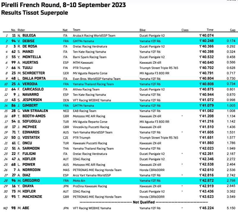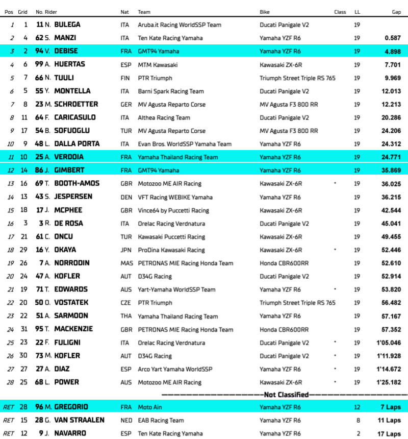 La grille de départ du Supersport comptera quelques nouveaux pilotes. Nicholas Spinelli manquera cette manche parce qu’il est engagé en MotoE à Misano et sera remplacé par le Danois Simon Jespersen. Can Oncu revient de sa blessure avec Kawasaki Puccetti Racing. Oli Bayliss (D34G Racing) manquera la manche Pirelli en France en raison d’une blessure contractée lors de la chute à Donington Park et sera remplacé par Andreas Kofler, le frère du coéquipier de Bayliss, Maximilian. Ondrej Vostatek (PTR Triumph) roulera jusqu’à la fin de la saison sur la moto de Harry Truelove tandis qu’Andy Verdoia défendra à nouveau les couleurs du Yamaha Thailand Racing Team à la place d’Apiwath Wongthananon. Deux wildcards sont présents ce week-end en France : Johan Gimbert (GMT94 Yamaha) et Matthieu Gregorio (Moto Ain).