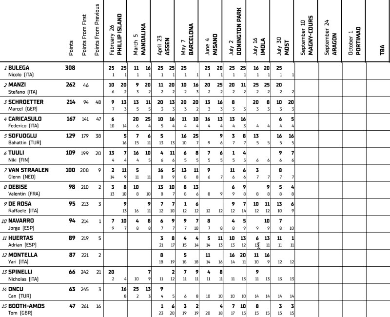 Marcel Schroetter, sur MV Agusta, est troisième au classement, à 94 points du leader. Lors des dernières courses, Federico Caricasulo a perdu du terrain au classement, souvent victime de malchance comme à Imola alors qu’il avait le potentiel pour viser très haut. Un autre pilote italien qui a récolté moins qu’il n’a semé est Yari Montella.