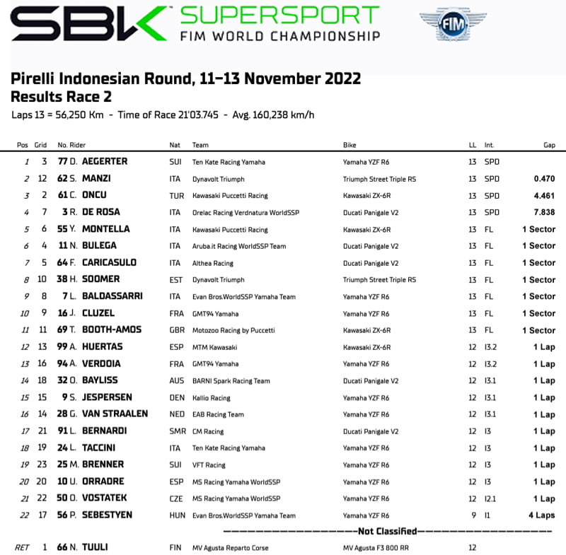 Même si les jeux sont faits, la course était très serrée. Niki Tuuli cherchait un rappel, avec la MV Agusta en grande forme sur cette piste. Mais Can Öncü, titulaire chez Kawasaki Pucetti, ne l’a pas laissé s’échapper, favorisant le retour d’Aegerter et d’un Manzi auteur d’un départ compliqué. Lorsque le drapeau rouge est sorti, le groupe était déjà étiré, les deux échappés se préparant à s’affronter jusqu’au bout. La Triumph se développe de façon exponentielle, Stefano Manzi a été très efficace et la possibilité de répéter la victoire de Portimão est concrète. Le Romagnol s’est consolé de la deuxième place avec le trois cylindres britannique qui pourrait devenir ambitieux en vue de 2023. Can Öncü complète le podium.