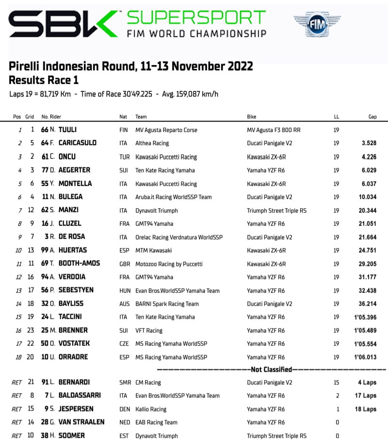 Résultats Course 1 WorldSBK Supersport à Mandalika  :