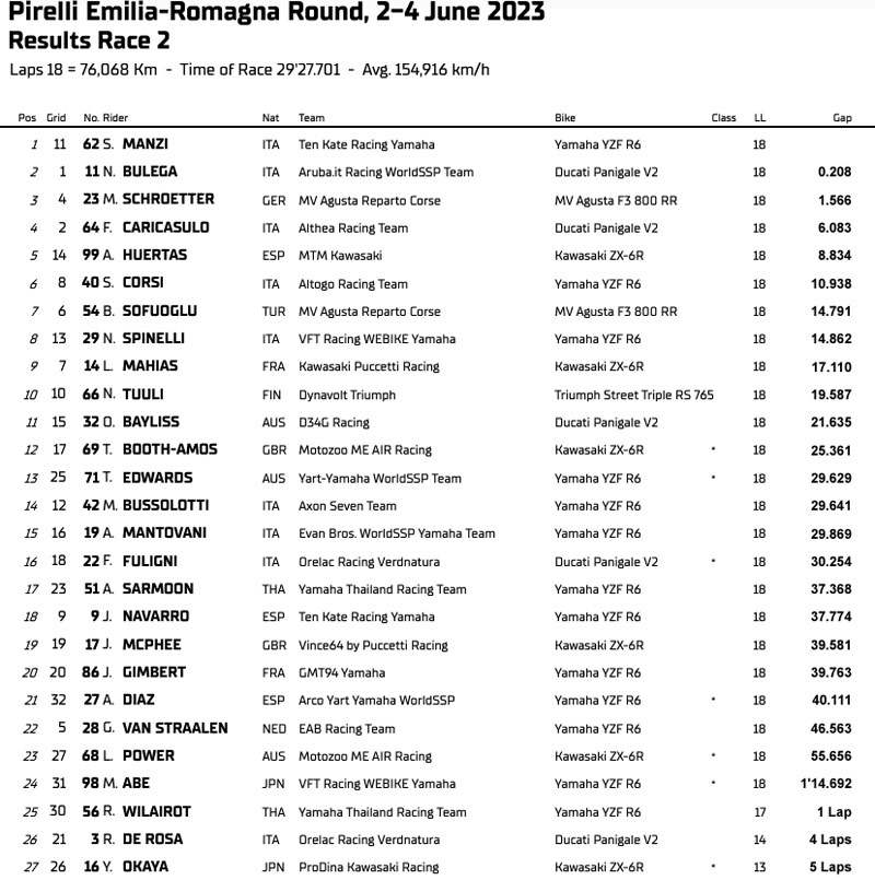 Résultats de la Course-2 des WorldSBK Supersport à Misano :