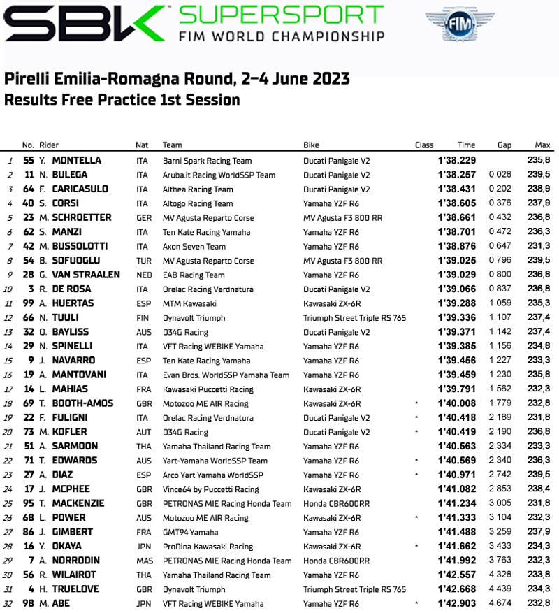 Résultats de la FP1 des WorldSBK Supersport à Misano :