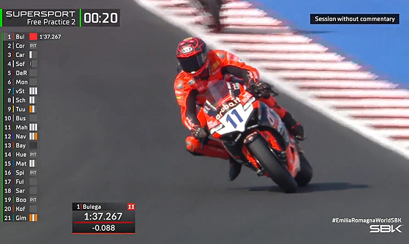 Les Yamaha sont plutôt rapides dans les deux premiers secteurs mais perdent du temps sur les Ducati dans les deux derniers. Toutefois, Simone Corsi ne renonce pas et parvient à 69/1000 de Nicolò Bulega à quatre minutes de la fin de séance.