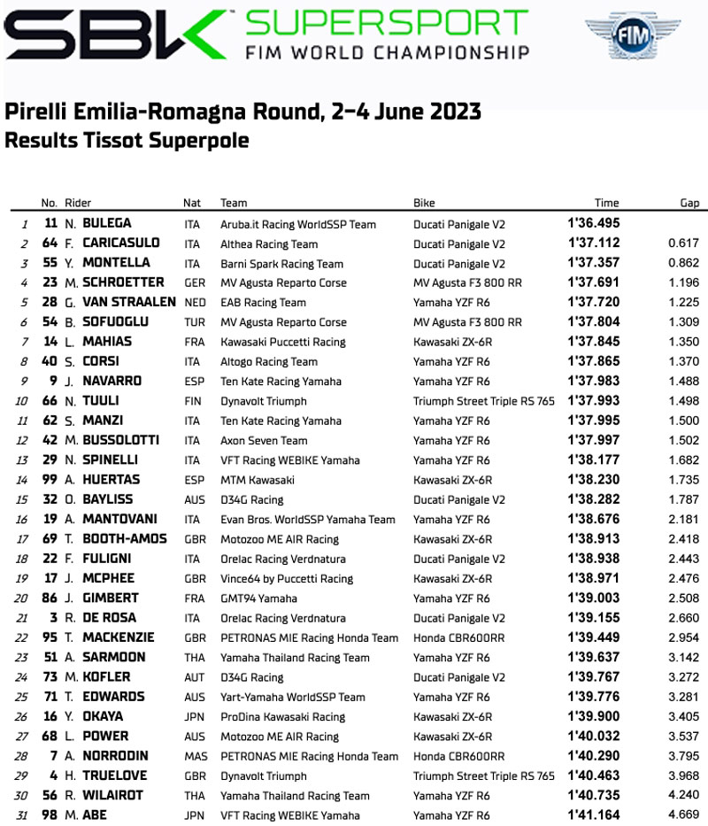 Résultats de la Superpole des WorldSBK Supersport à Misano :