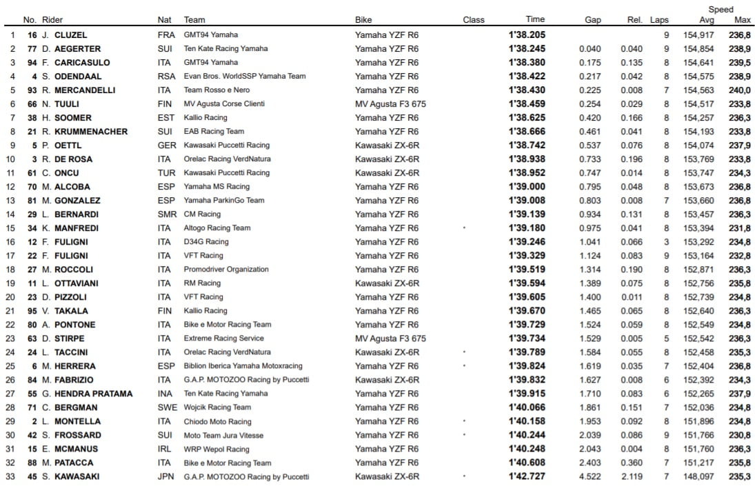 Pour son coéquipier Federico Caricasulo, victime d’une chute hier lors de la première épreuve et en mal de points au championnat, ce warm-up est rempli d’espoirs étant donné que l’Italien a terminé troisième. Il devance Steven Odendaal, qui tentera dans quelques heures d’empêcher Aegerter de s’enfuir au championnat.