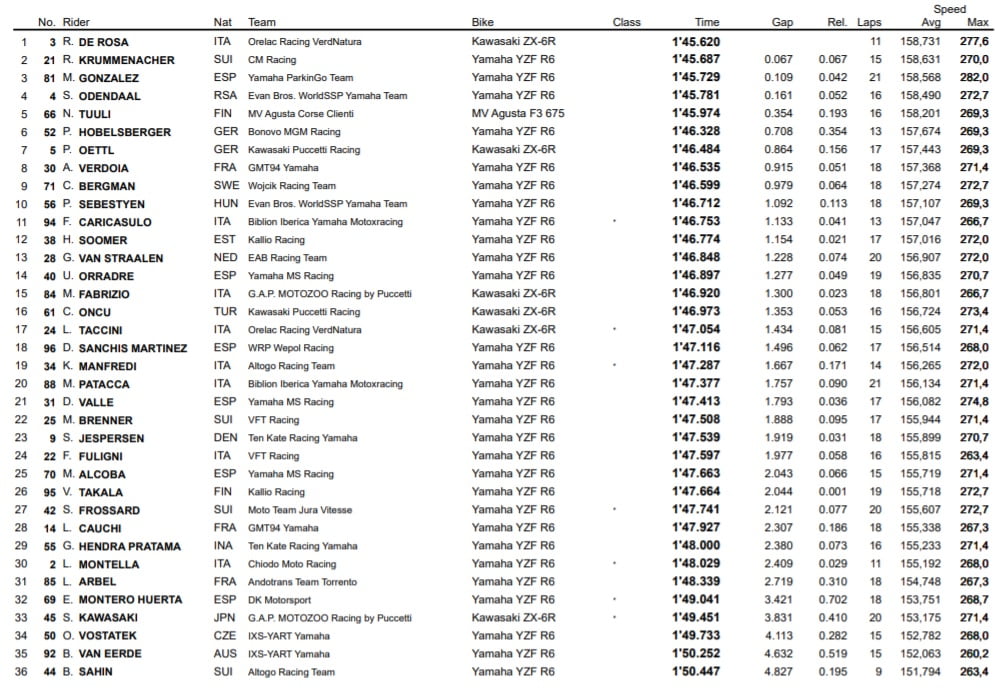 Le pilote italien a réalisé le meilleur chrono de la journée devant Randy Krummenacher, ce dernier qui a pourtant été victime dans les dernières minutes d’une chute mais qui a tout de même pu repartir pour défendre sa position au classement.