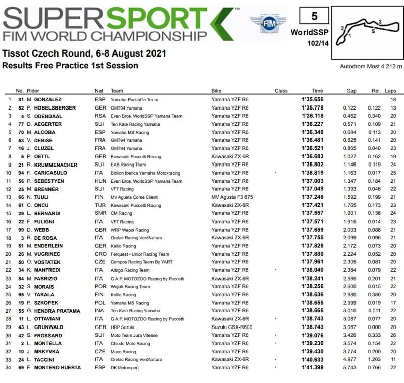 WSBK Supersport Most : Classement de la FP1