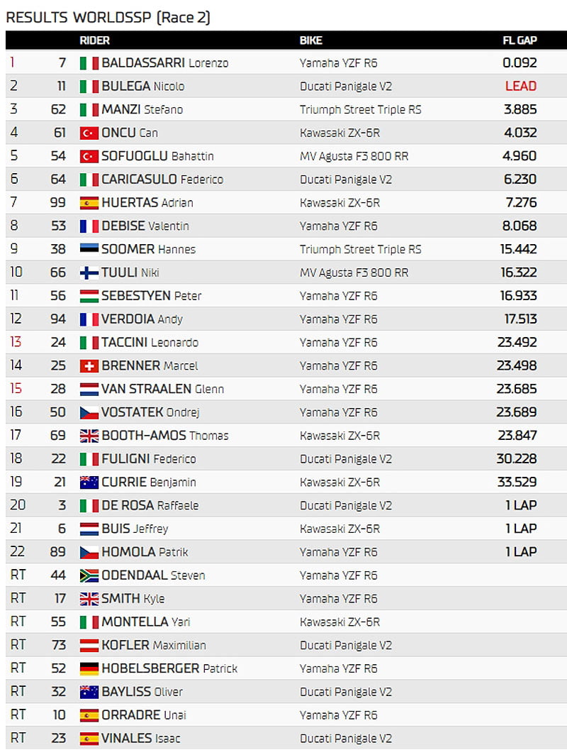 Steven Odendaal (Kallio Racing) chute, Raffaele De Rosa (Orelac Racing Verdnatura WorldSSP) abandonne, juste avant que Lorenzo Baldassarri reprenne le leadership et que le drapeau rouge soit agité dans le 15e tour.