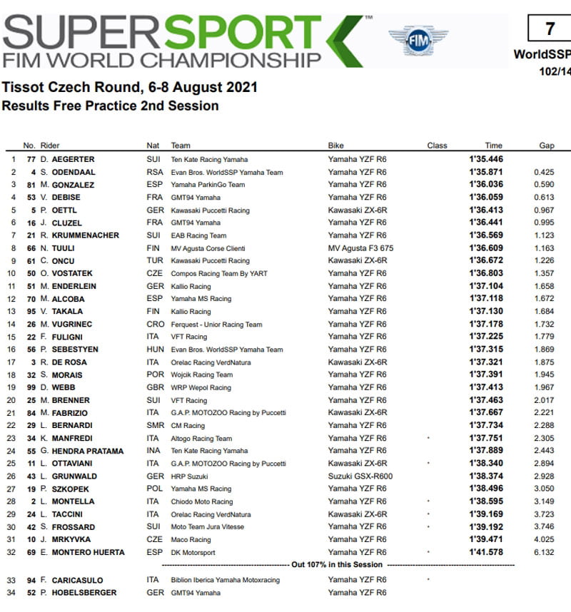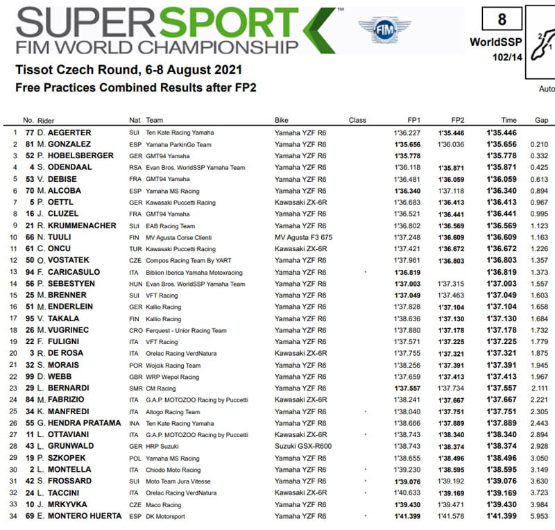 Top 5 pour Debise, qui remplace Caricasulo (désormais chez Motoxracing) dans l’équipe Yamaha du GMT94. Le Français devance également son nouveau coéquipier Cluzel, 8ème à l’issue des deux séances, tandis qu’entre eux on retrouve Alcoba et Öttl. Niki Tuuli ferme le top 10, précédant Öncü et Vostatek (wildcard) avant de retrouver Caricasulo (qui, cependant, n’a pas de temps en FP2). On retrouve ensuite Sebestyen (protagoniste d’une chute due à un contact avec un autre coureur) et Brenner, premier au-dessus du mur des 1’37.