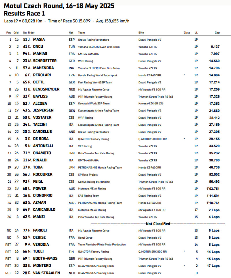 Samedi, depuis la cinquième ligne de la grille de départ, Jaume Masia (Orelac Racing Verdnatura) est devenu le cinquième vainqueur différent en WorldSSP cette saison. L’Espagnol est revenu de l’arrière dans le dernier tour pour attaquer Can Oncu (Yamaha BLU CRU Evan Bros Team) au virage 20 et remporter la victoire.