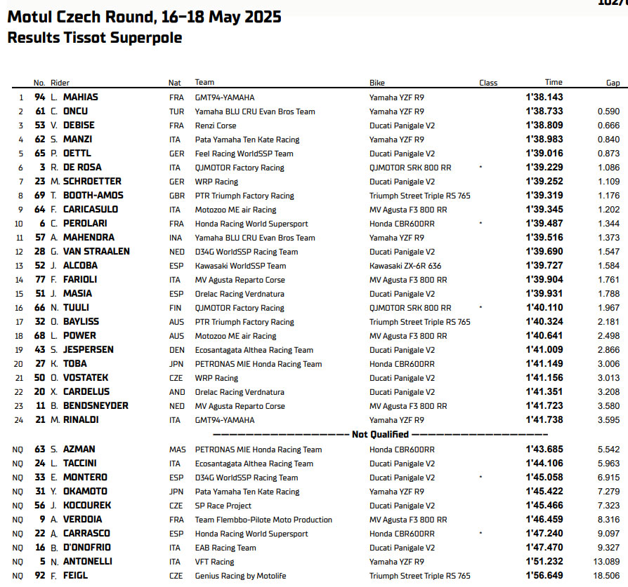 Le leader du championnat du monde Stefano Manzi (Pata Yamaha Ten Kate Racing) s’est qualifié sur la deuxième ligne, 0.840s plus lent que Mahias, tandis que son challenger Bo Bendsneyder (MV Agusta Reparto Corse) s’alignera à partir de la 23ème place sur la grille.