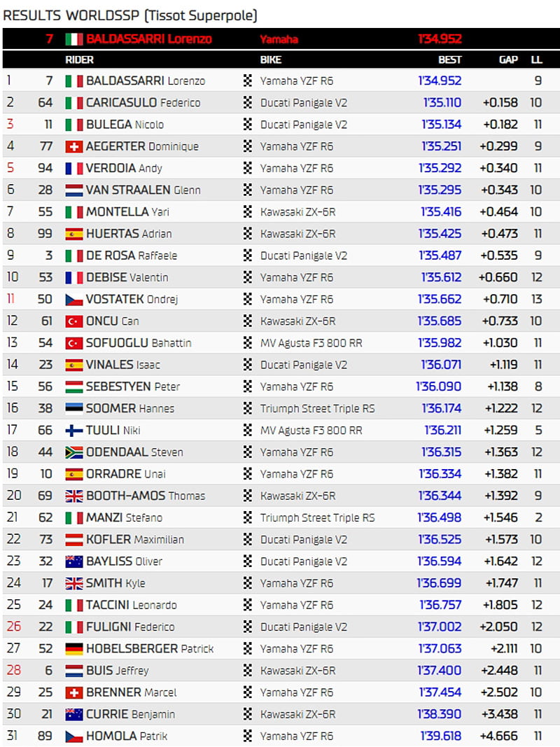 Le suspens pourrait donc sembler très réduit en ce qui concerne le favori pour la 300e course de l’histoire du WorldSSP, mais Nicolò Bulega (Aruba.it Racing WorldSSP Team) n’est qu’à 8 centièmes du pilote suisse et précède de 5 centièmes Federico Caricasulo (Althea Racing); autant dire que les Ducati ne sont pas loin, et même plus proches que jamais, bien que toujours en quête d’un premier succès…
