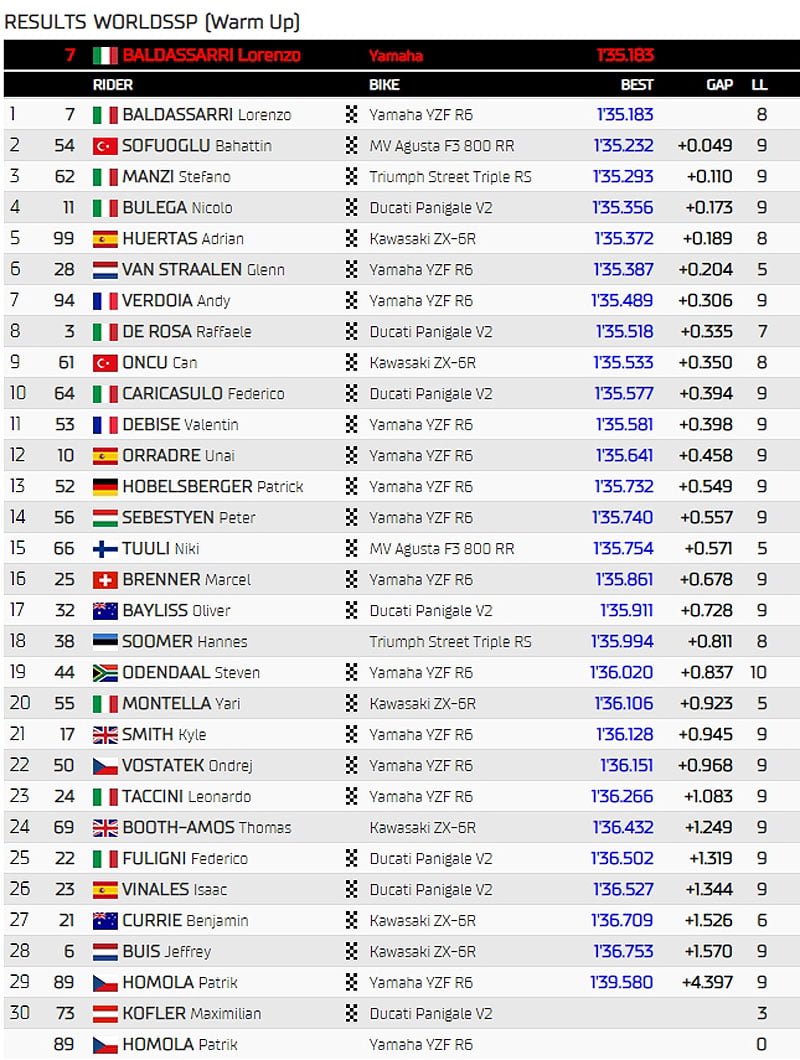 Certes, la méthode est pour le moins contestable mais le résultat est là : le leader du championnat du monde ne défendra pas ses chances en République Tchèque et Lorenzo Baldassarri (Evan Bros. WorldSSP Yamaha Team) a pris sa place sur la plus haute marche du podium pour la deuxième fois cette année.