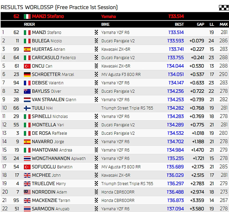 Oli Bayliss (D34G Racing) vient encore renforcer les chances de Ducati tandis que Niki Tuuli (Dynavolt Triumph) place la première Triumph dans le Top 10. Adrian Huertas (MTM Kawasaki), qui ferme celui-ci est attendu plus haut dan la hiérarchie.