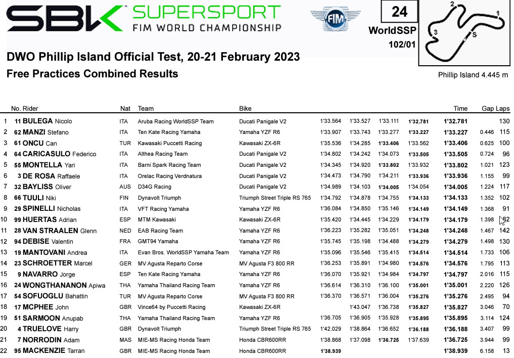 Comme en Superbike, ce sont 22 pilotes qui vont s’affronter lors de la saison 2023 du Championnat du Monde FIM Supersport qui débute sur le circuit de Phillip Island en Australie, après deux jours d’essais sur le même tracé en début de semaine qui, comme les tests hivernaux à Jerez et Portimão, ont été dominés de main de maître par Nicolò Bulega (Aruba.it Racing WorldSSP Team). L’officiel Ducati fait donc figure d’épouvantail, même si un autre italien, Stefano Manzi (Ten Kate Racing Yamaha) s’est avéré son plus coriace adversaire sur le tracé australien.
