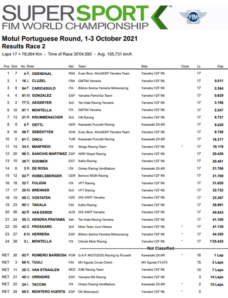 Sixième position pour un Yari Montella plus que positif, suivi de Krummenacher, Öttl et Sebestyen. Öncü ferme le top 10, puis Manfredi (qui conquiert simultanément le titre du WorldSSP European Challenge) et Sanchis Martinez. Soomer, De Rosa et Hobelsberger sont également dans les points, juste devant Fuligni. 24e Montella, Taccini out. Van Straalen et Orradre ont abandonné.