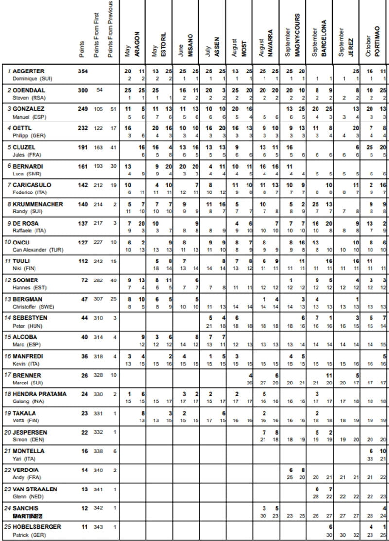 Retour sur le podium pour l’auteur italien d’une belle reprise et d’une lutte pour le succès jusqu’au bout. 5e place pour le leader Aegerter, légèrement dans l’ombre par rapport à l’habitude et détaché des quatre premiers qui se sont battus pour la victoire jusqu’au drapeau à damier. Le groupe était en fait très compact, comme hier, mais les chutes de Tuuli et De Rosa dans les dernières phases ont favorisé l’échappée d’Odendaal, Cluzel, Caricasulo et González.