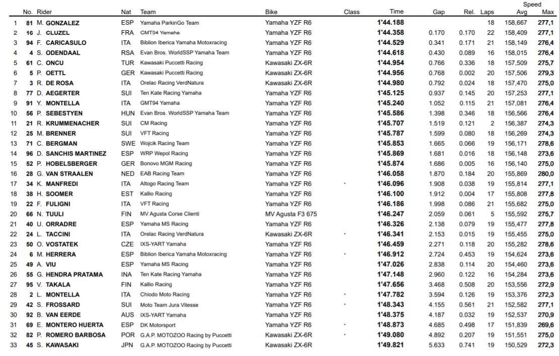 Au classement, on retrouve derrière González et Cluzel l’Italien Federico Caricasulo, suivi d’Odendaal et de Can Öncü. Öttl boucle quant à lui ces FP1 à la sixième place, devant Raffaele de Rosa et Aegerter. Le top 10 est complété par Yari Montella, victime d’une chute en fin de séance, ainsi que Peter Sebestyen.
